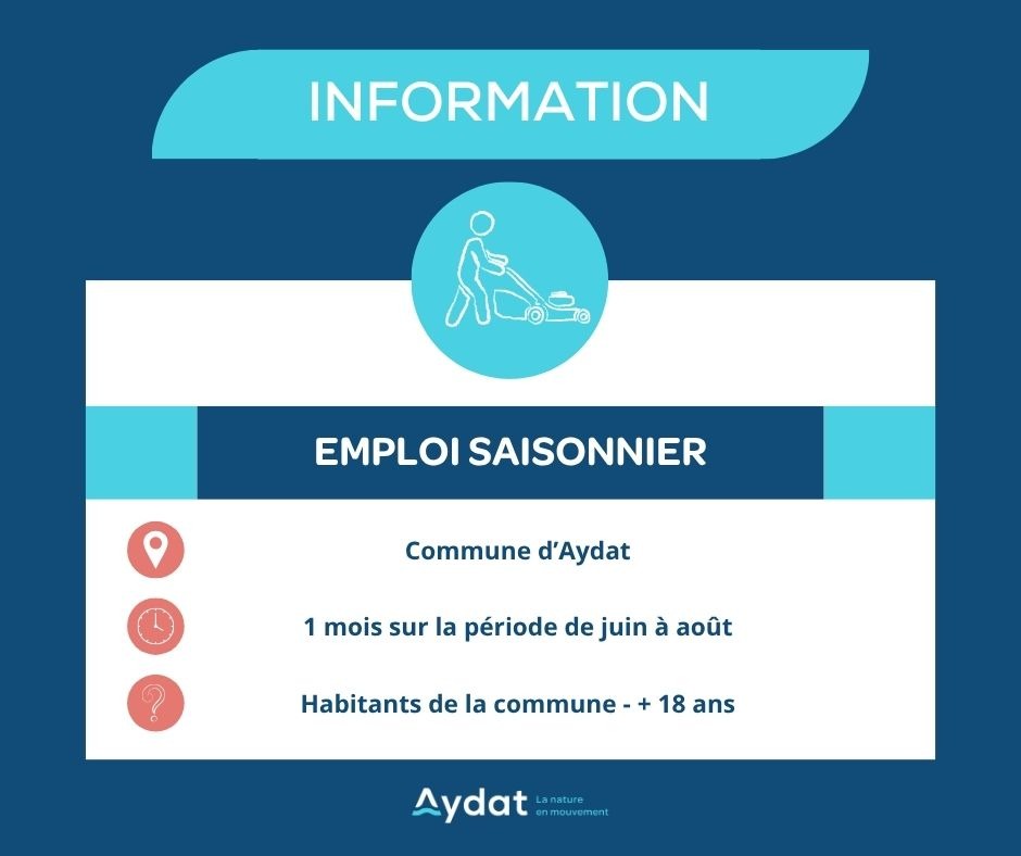 Dans le cadre du renfort des Ă©quipes techniques pendant la pĂ©riode estivale, la commune dâAydat recrute des agents saisonniers pour lâentretien des espaces verts.