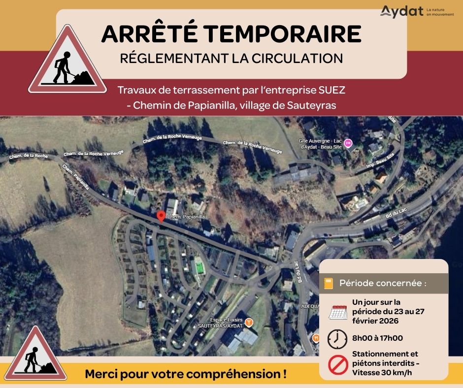 Dans le cadre de travaux de terrassement destinĂ©s Ă  la remise Ă  niveau de la bouche Ă  clĂ© du poteau d’incendie, rĂ©alisĂ©s par l’entreprise SUEZ, la circulation sera temporairement rĂ©glementĂ©e chemin de Papianilla, au village de Sauteyras.