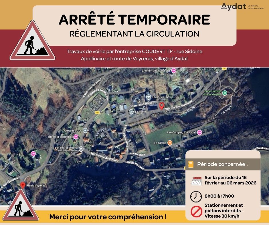 Pour permettre les divers travaux de voirie par l’entreprise COUDERT TP pour le compte de la commune, la circulation de tous les vĂ©hicules sera rĂ©glementĂ©e au moyen d’une circulation alternĂ©e, rue Sidoine Apollinaire / Route de Veyreras.