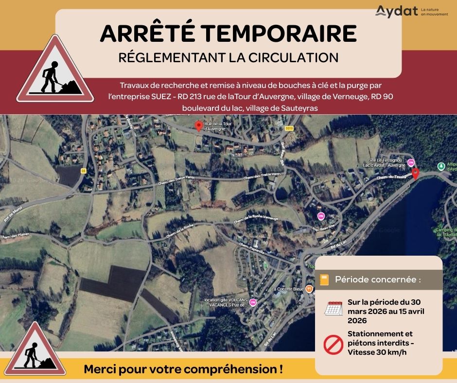 Pour permettre la recherche et la remise Ă niveau de bouches Ă clĂ© et la purge par l’entreprise SUEZ, la circulation de tous les vĂ©hicules sera rĂ©glementĂ©e au moyen d’une circulation alternĂ©e, RD 213 rue de la Tour d’Auvergne, village de Verneuge et RD 90 boulevard du lac, village de Sauteyras.