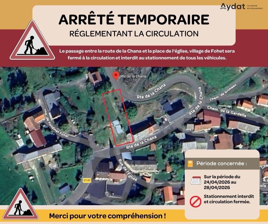 ArrĂȘtĂ© temporaire portant Ă  la rĂ©glementation de la circulation – Village de Fohet